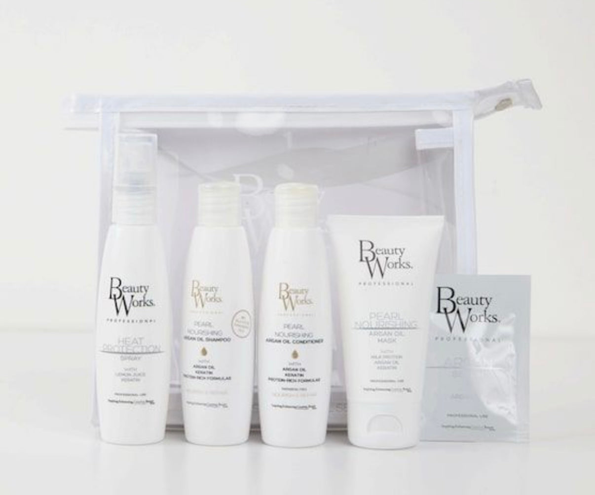 Beauty Works Pearl Nourishing Travel Set í glærri tösku.